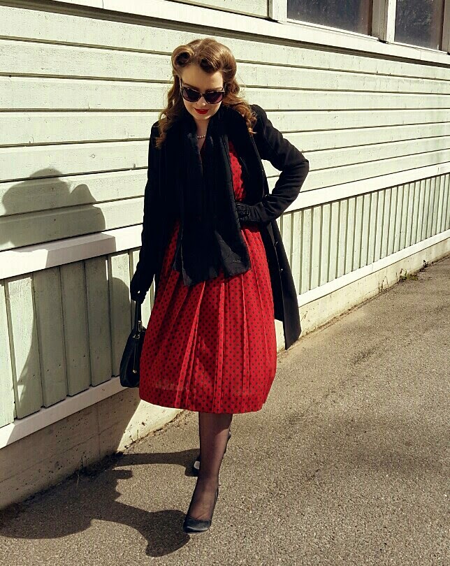 Hauska fakta tästä mekosta: olin katsellut sitä jo aiemmin, niinkin paljon aiemmin kuin joulukuussa! Silloin se jäi vielä ostamatta, koska löysin samasta putiikista kivan villatakin, jonka ostin mieluummin. Yllätyin kun tämä oli vielä tallella kyseisessä liikkeessä, joskin yleensä tällaiset vintagemekot eivät hirveän helposti tule myydyiksi. Onneksi!